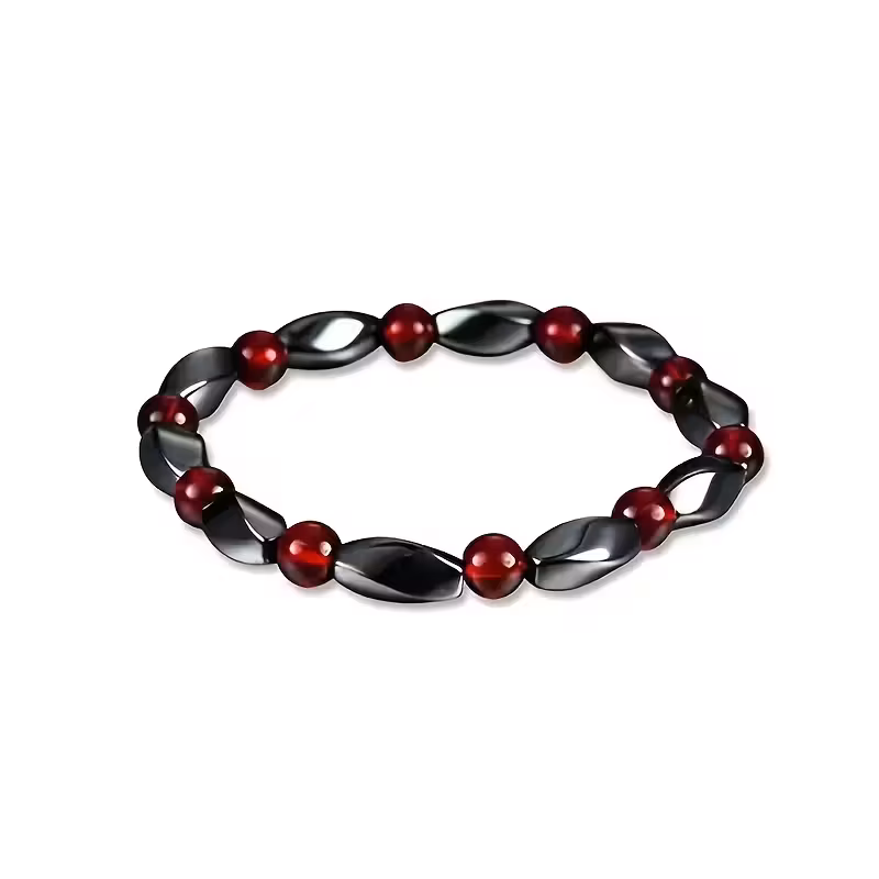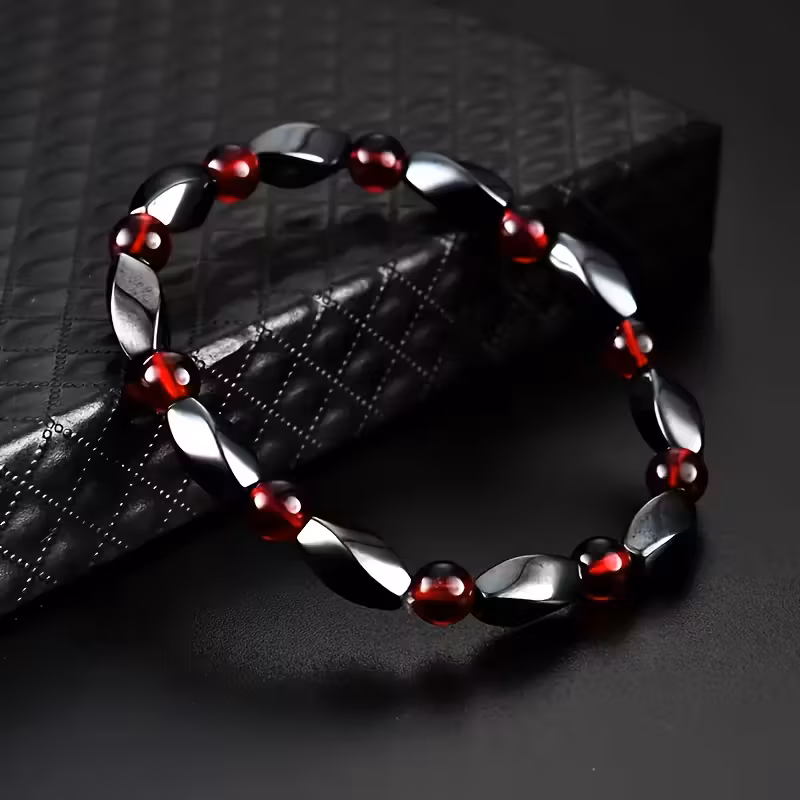 Model ten charakteryzuje się nowoczesnym wzornictwem opartym na kontraście geometrycznym. Ciemne elementy mają specyficzny, skręcony kształt, który efektownie odbija światło, imitując wygląd hematytu. Są one przeplatane półprzezroczystymi, czerwonymi kulkami, które dodają biżuterii wyrazistego akcentu kolorystycznego.
