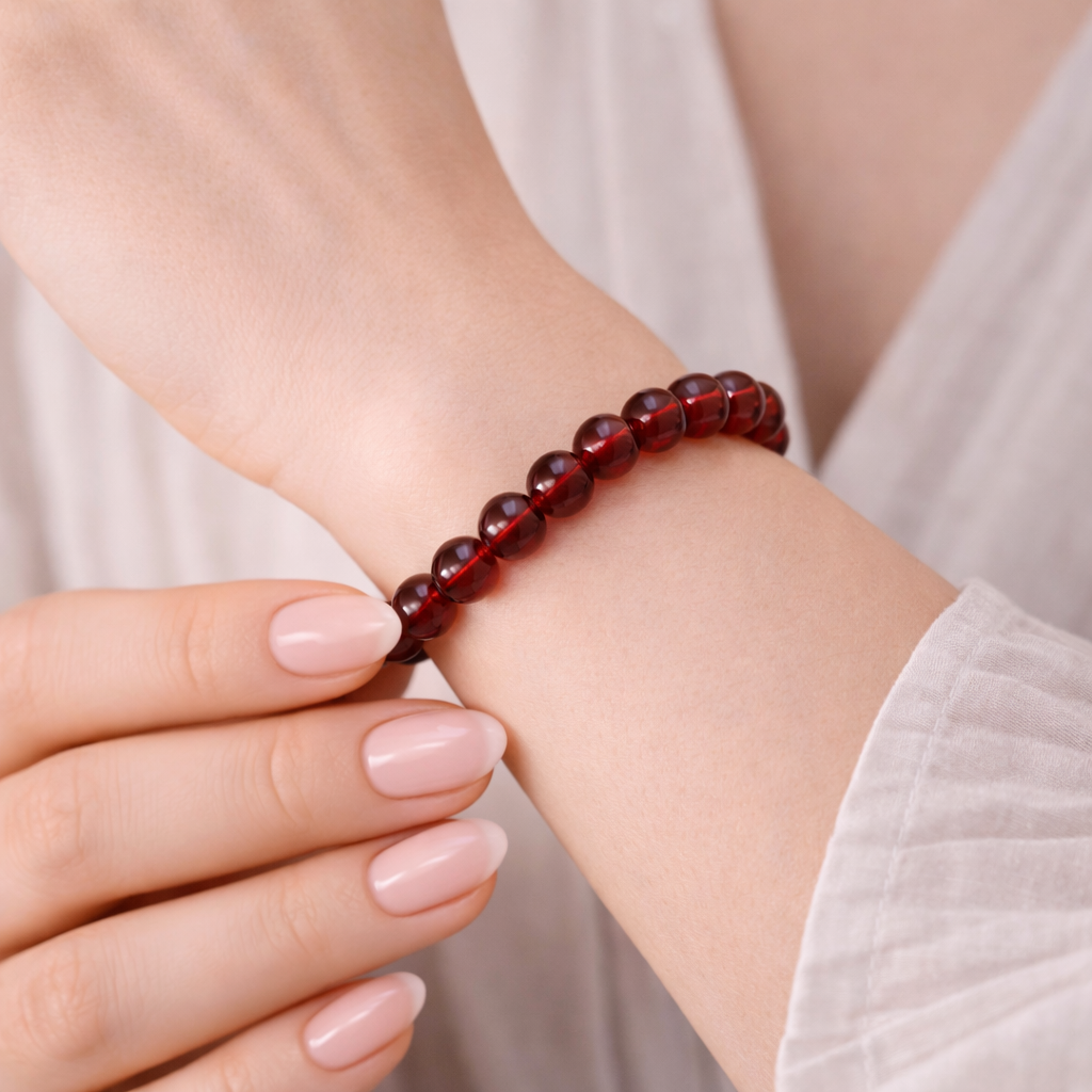 Ta efektowna bransoletka to propozycja dla osób lubiących wyraziste, energetyczne akcenty w swojej garderobie. Składa się z szeregu idealnie okrągłych koralików w odcieniu soczystego karminu (rubinowa czerwień). Ich szklista, lekko transparentna struktura pięknie przepuszcza i odbija światło, nadając biżuterii głębi oraz subtelnego blasku.