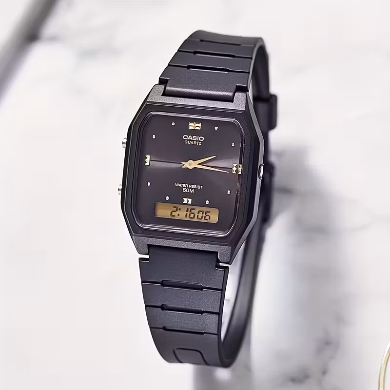 Model ten łączy minimalistyczną elegancję z funkcjonalnością typową dla zegarków sportowych. Na ciemnej tarczy umieszczono złote wskazówki oraz subtelne indeksy, co nadaje mu nowoczesnego wyglądu. Dolna część tarczy zawiera cyfrowy wyświetlacz, który pozwala na korzystanie z dodatkowych funkcji bez zakłócania odczytu godziny analogowej.